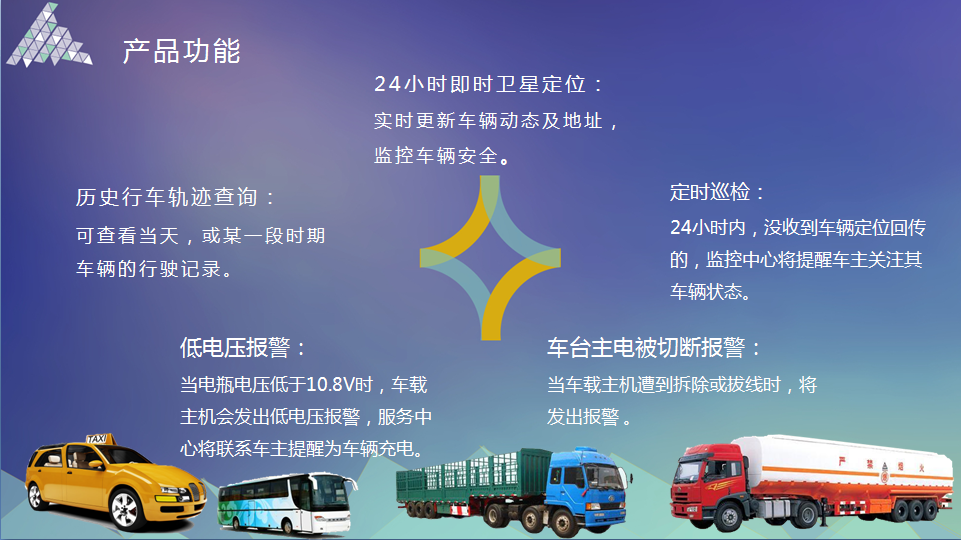 這是一款交通部指定安裝的產品,具有行駛記錄功能的車輛衛星定位裝置,主要功能有: