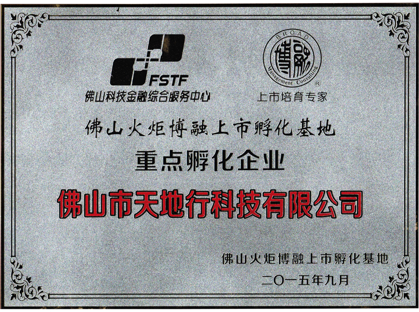 2015年9月22日,天地行獲得佛山科技金融綜合服務中心授牌“重點孵化企業”。