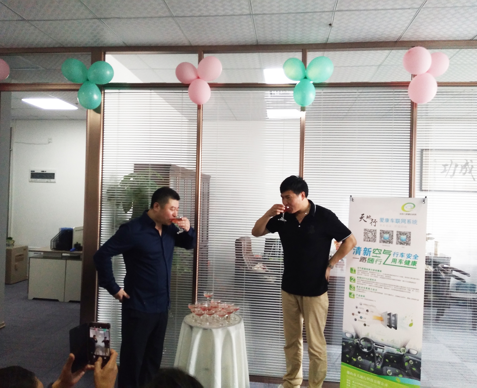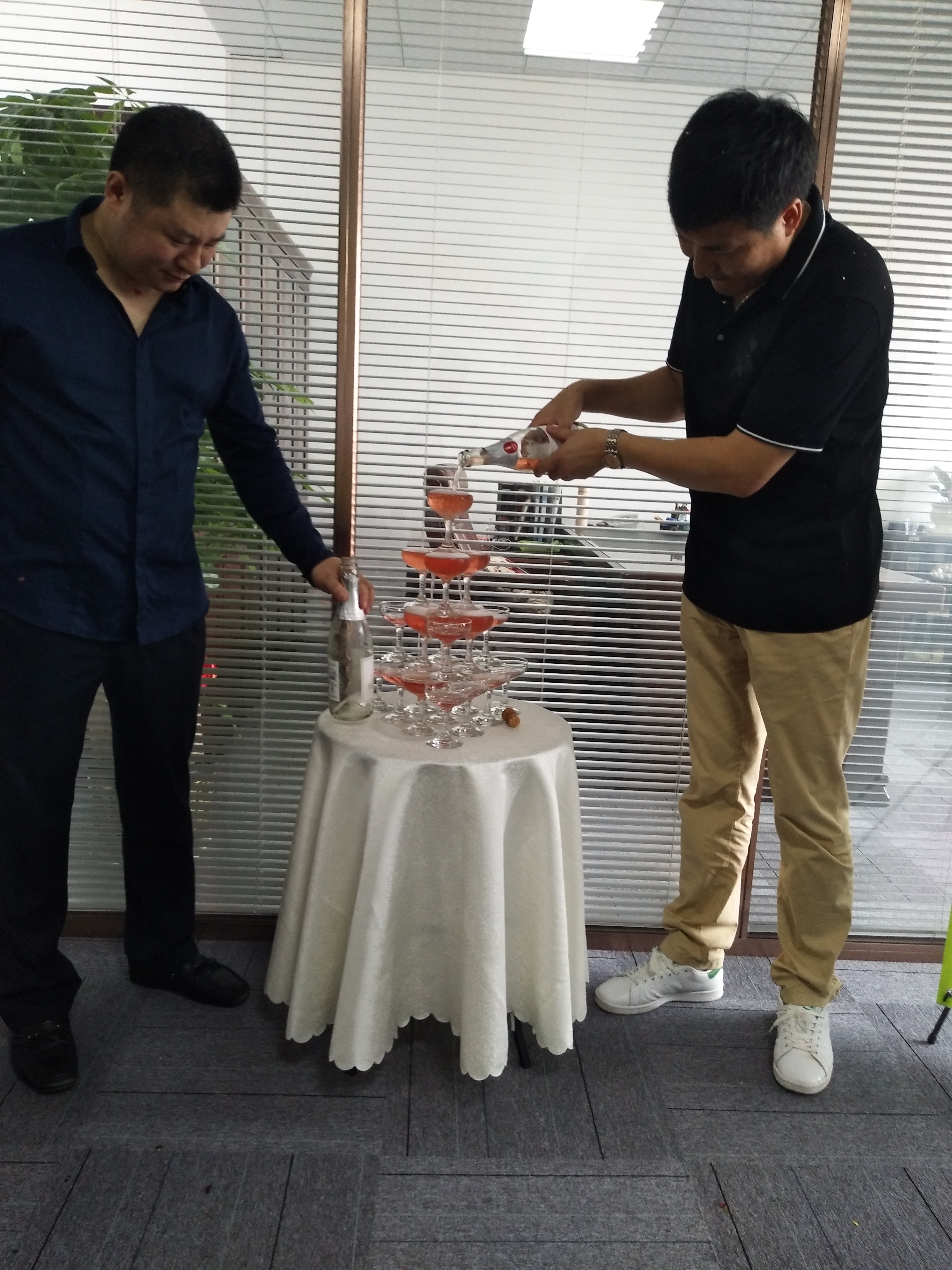 天地行董事長徐柱先生與星礪達總經理王文濤先生緩緩斟滿吉祥如意的香檳塔,象征著生意興隆,源遠流長!